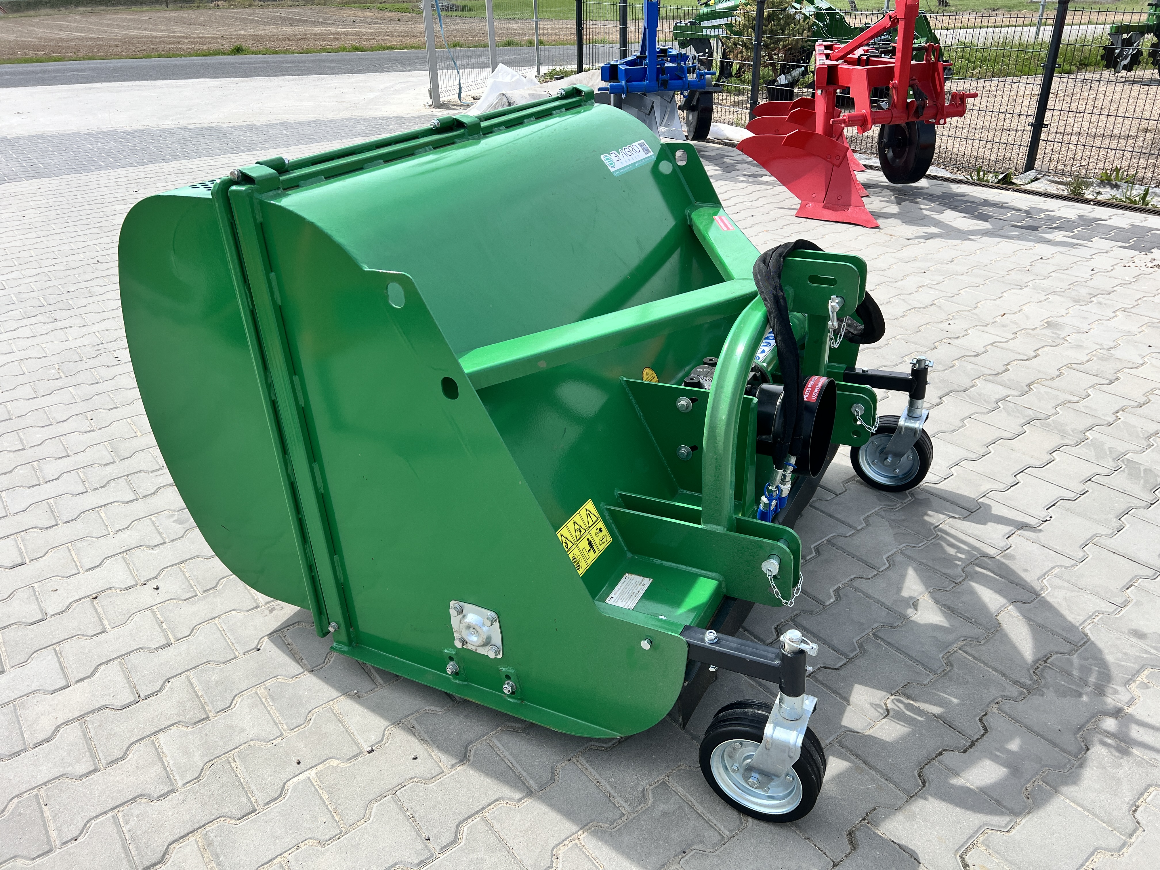 KOSIARKA BIJAKOWA Z KOSZEM marki TRX model FCN 90 to kosiarka mulczująca klasy średniej z pojemnym, hydraulicznie otwieranym koszem o pojemności 0.63m3 do zbierania skoszonego materiału i wysypu na ziemię.