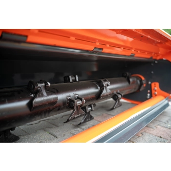 Kosiarka standardowo wyposażona jest w 24 młotki bijakowe o wadze 700 g, które skutecznie rozdrabniają twardą i wysoką roślinność. Napęd realizowany jest przez 3 paski klinowe, a przekładnia kątowa zapewnia bezpieczne przenoszenie mocy podczas intensywnej pracy.