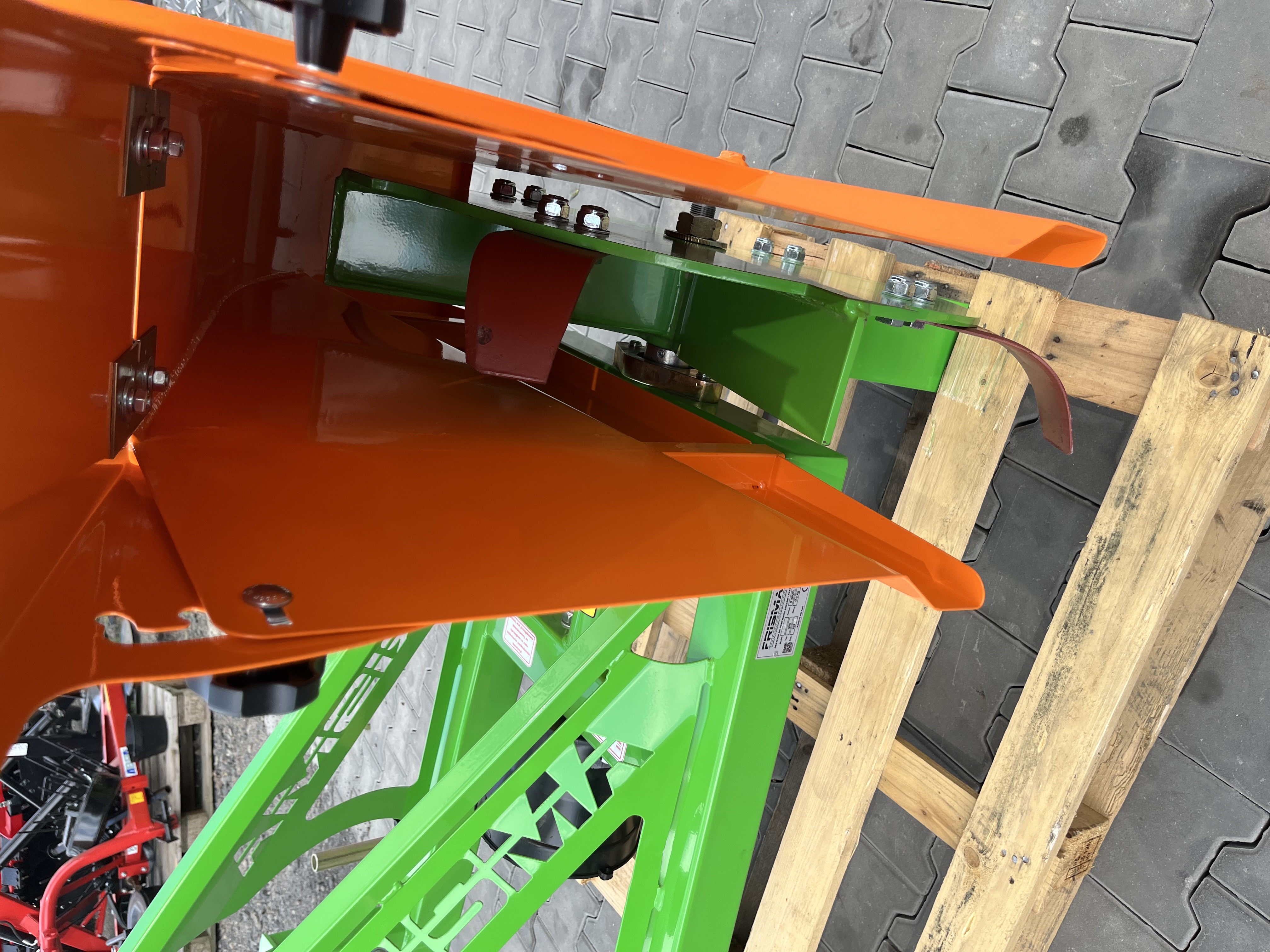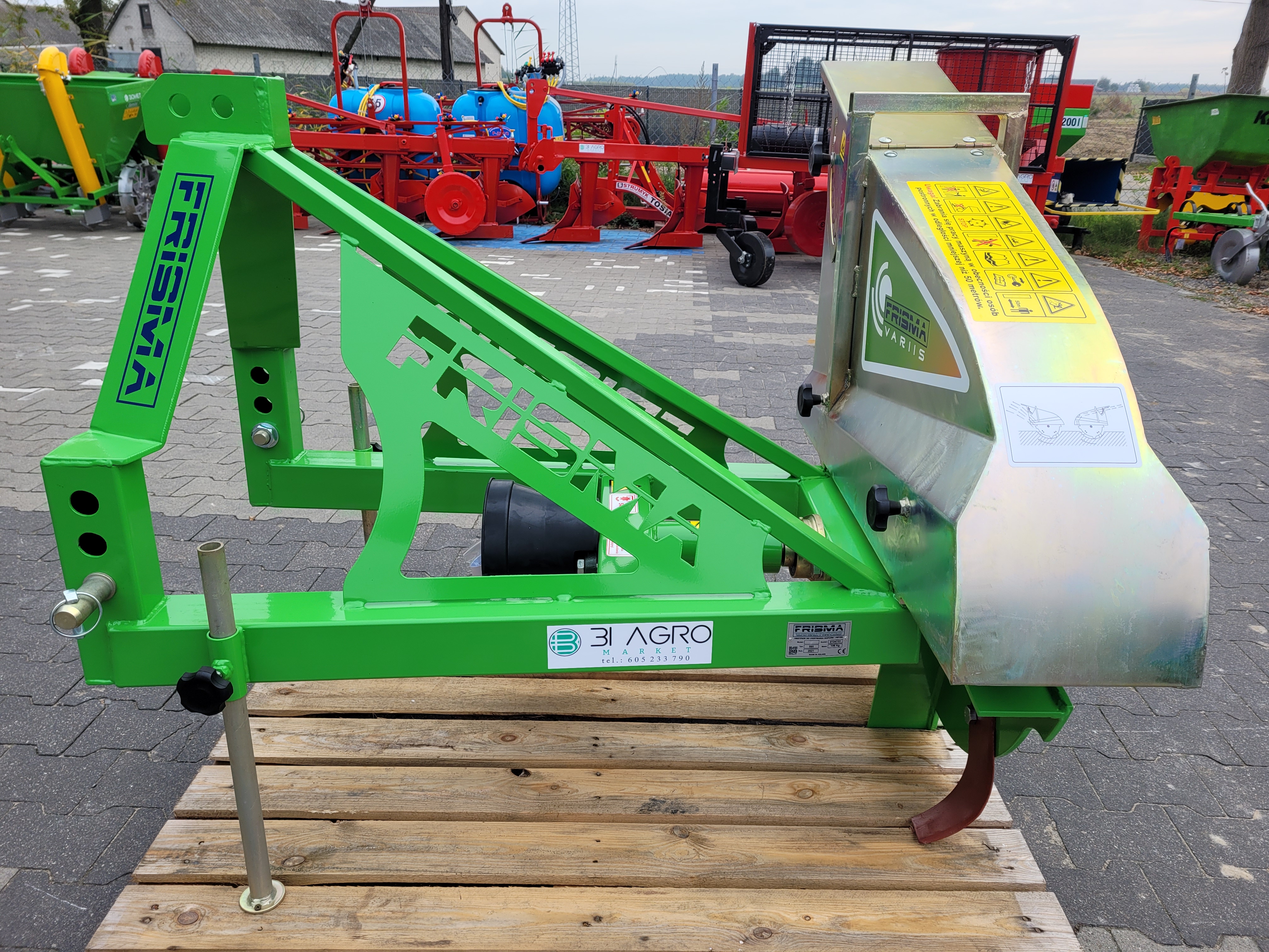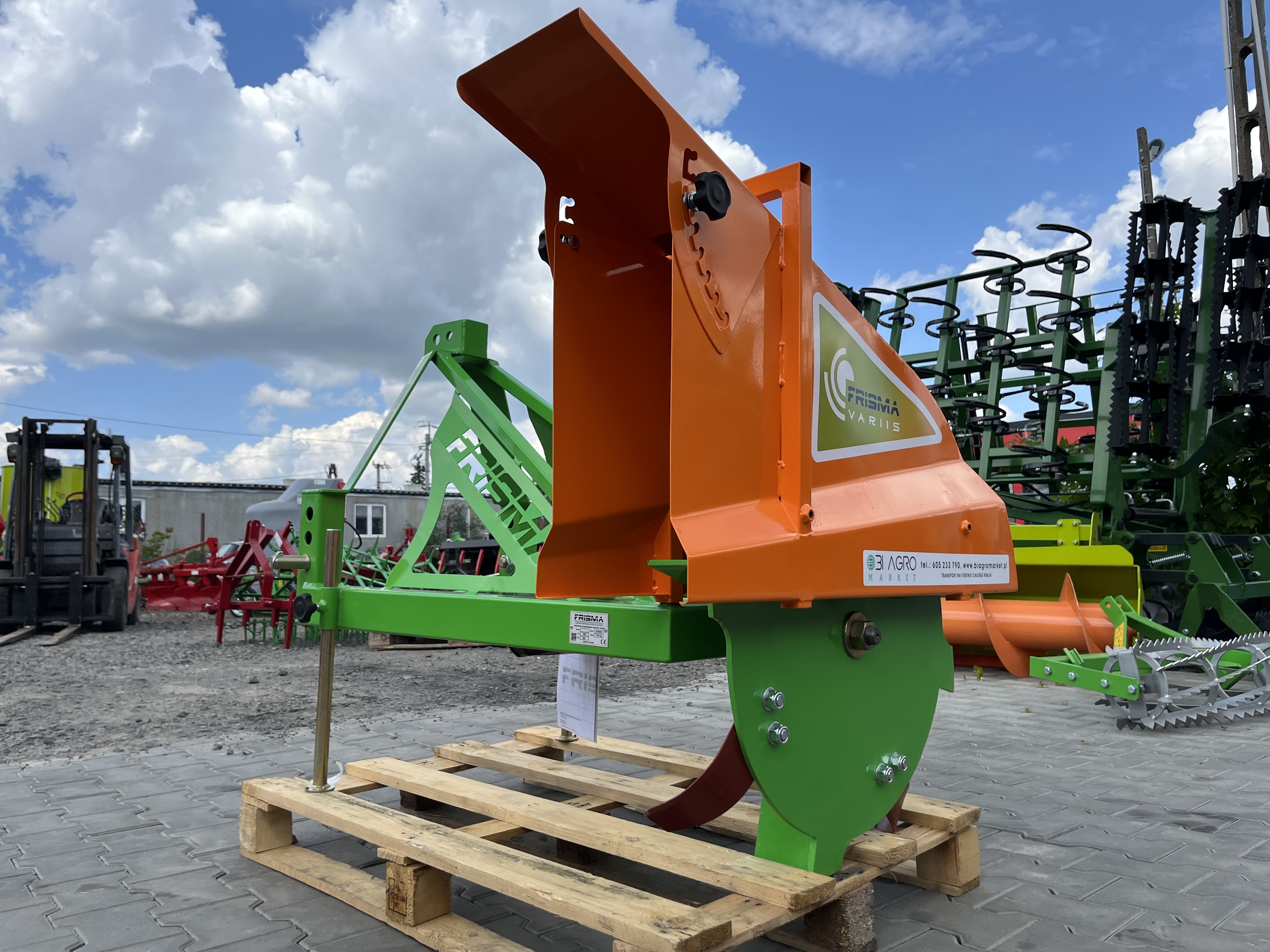 Obsypnik marki Frisma model S595 służący do mechanicznego obsypywania pryzm/kopców. Maszyna posiada zaczep trzypunktowy oraz napęd przekazywany jest przez wałek WOM. Obsypnik posiada możliwość ustalenia wysokości wyrzutu ziemi za pomocą regulowanej osłony.